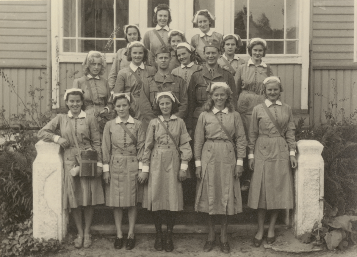 Titel: Gruppfoto av sjuksköterskor och två män i uniform m/1939 på en trappa.