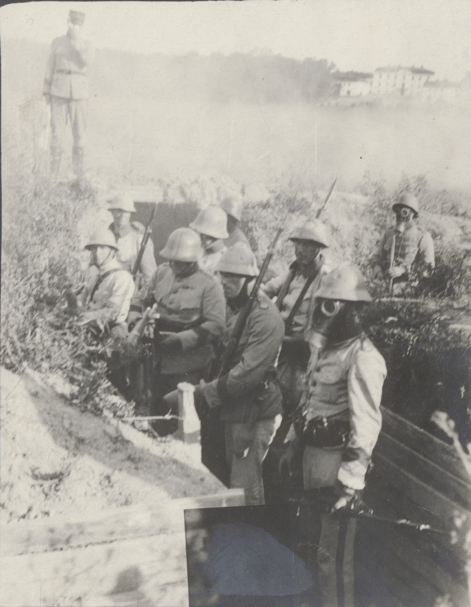 Gasskyddsövning i skyttegrav, uniform m/1910.