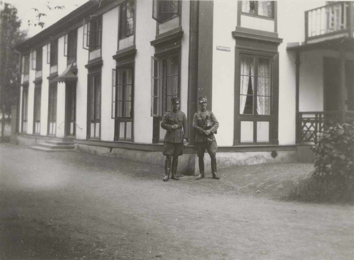 Titel: Hallands regemente I 16. Två officerare framför ett stort trähus.