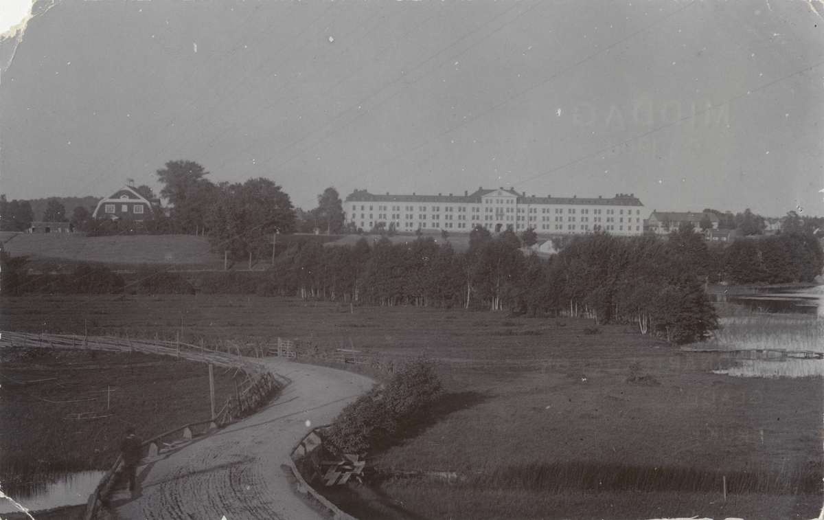 Titel: Regementsbyggnad med slingrande grusväg i förgrunden.