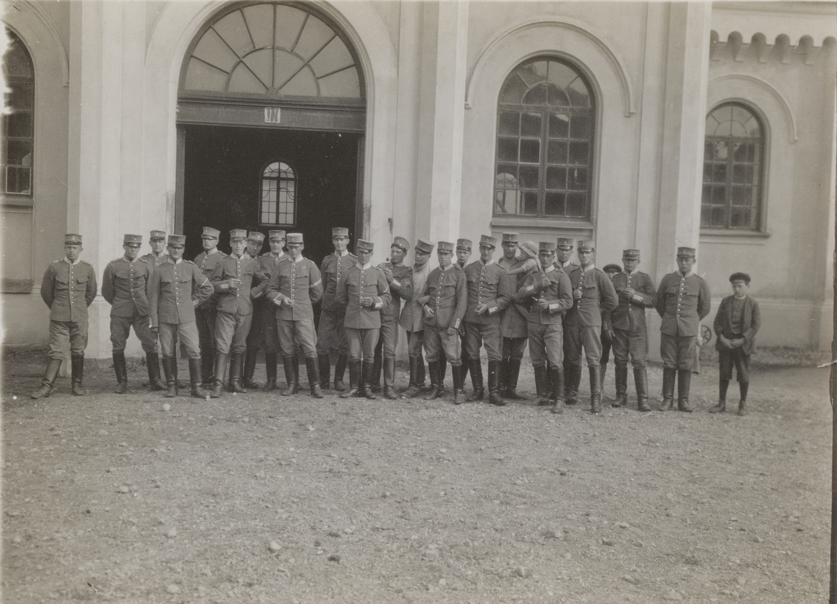 Gruppfoto utanför stall, Livregementet till häst K 1.