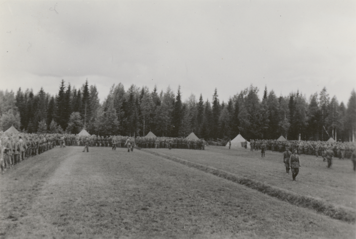 Infanteri uppställt i fyrkant, tält och träd i bakgrunden.
