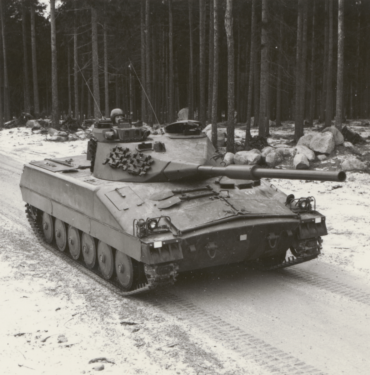 Pansarfordon, infanterikanonvagn ikv 91 på skogsväg.