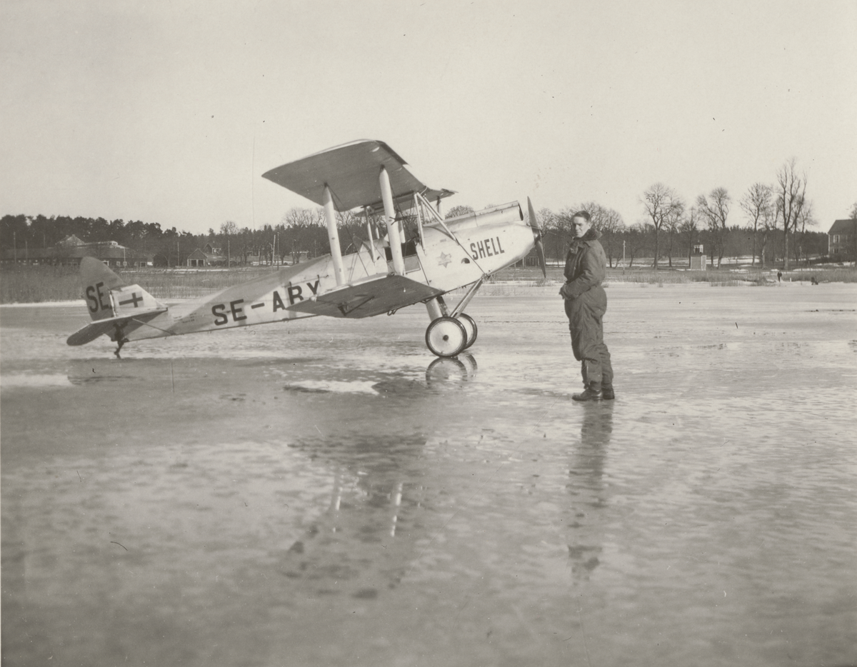 Flygplan, De Havilland DH Tiger Moth, på våt landningsbana.