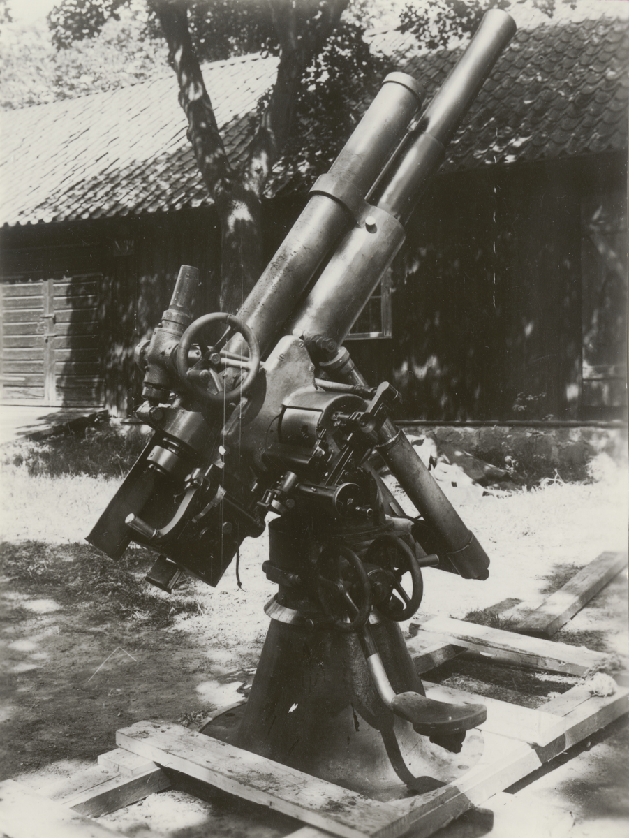 7,5 cm luftvärnskanon m/1918, uppställd utanför ladugårdsbyggnad.