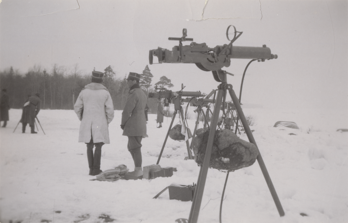 Rad med luftvärnskulsprutor m/1936, uppställda på snöigt fält.
