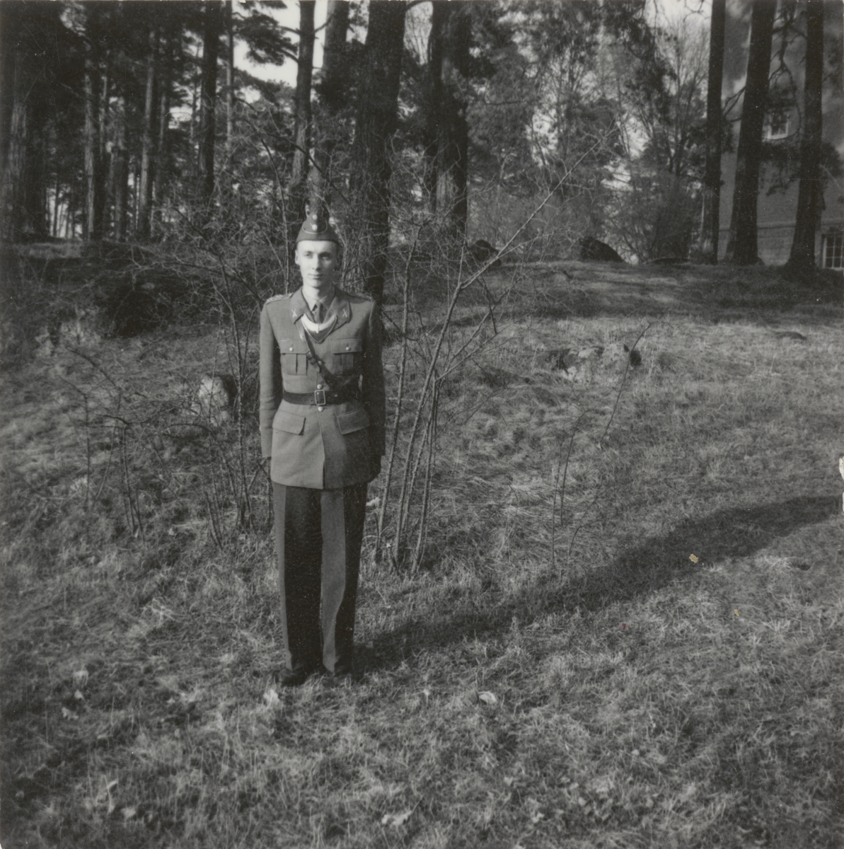 Infanterist i uniform med lägermössa, koppel och vaktbricka. Livgrenadjärregementet I 4.