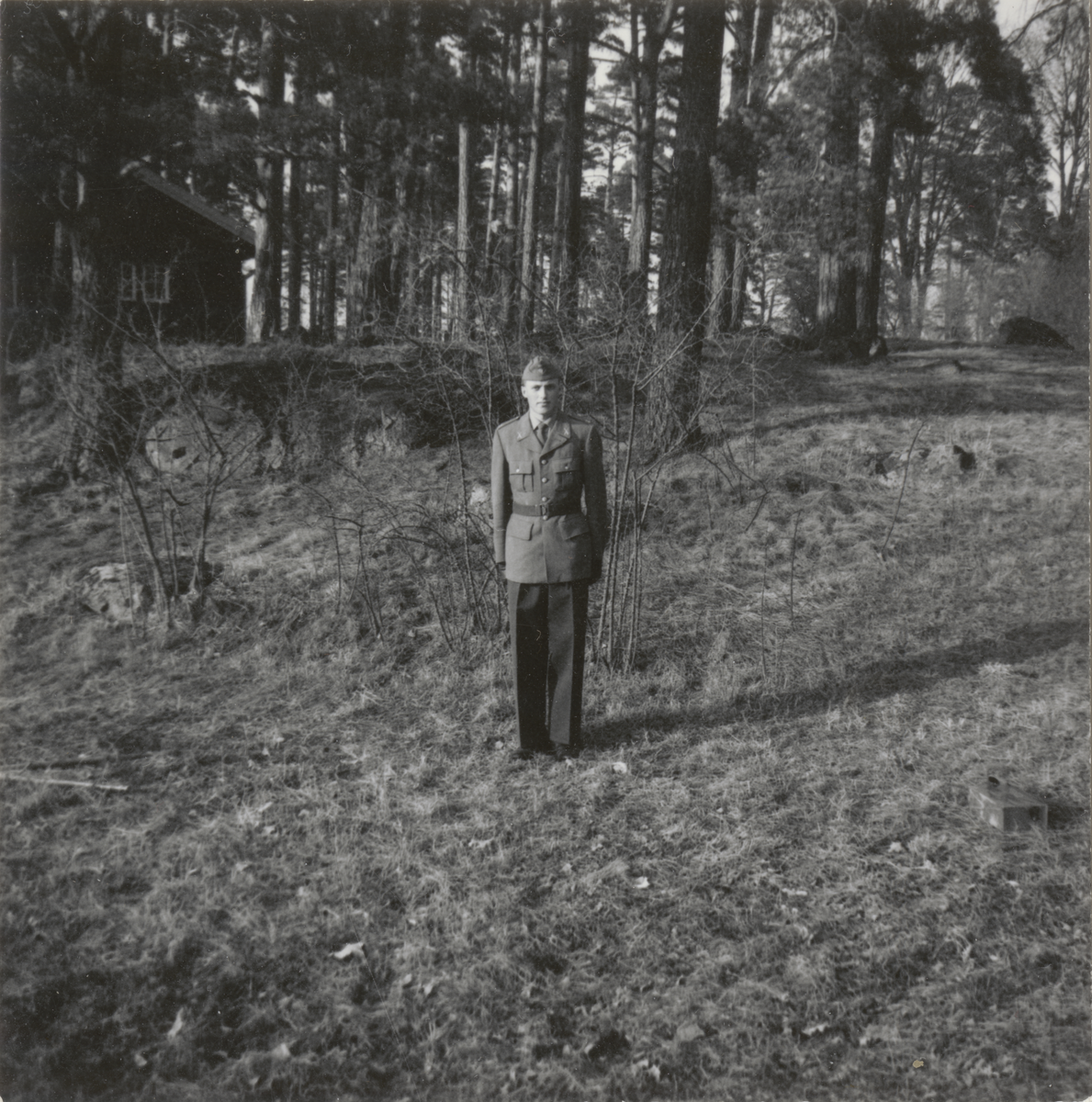 Infanterist i uniform m/1939 med lägermössa och skärp, Livgrenadjärregementet I 4.