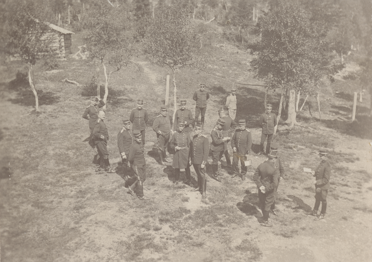 Titel: Hälsinge regemente I 14 Mohed. Officerare bland träd.