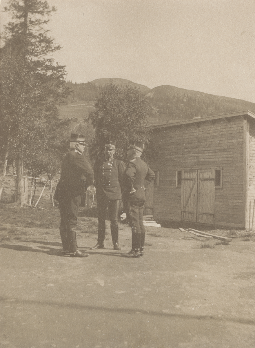 Titel: Hälsinge regemente I 14. Tre officerare vid ett skjul.