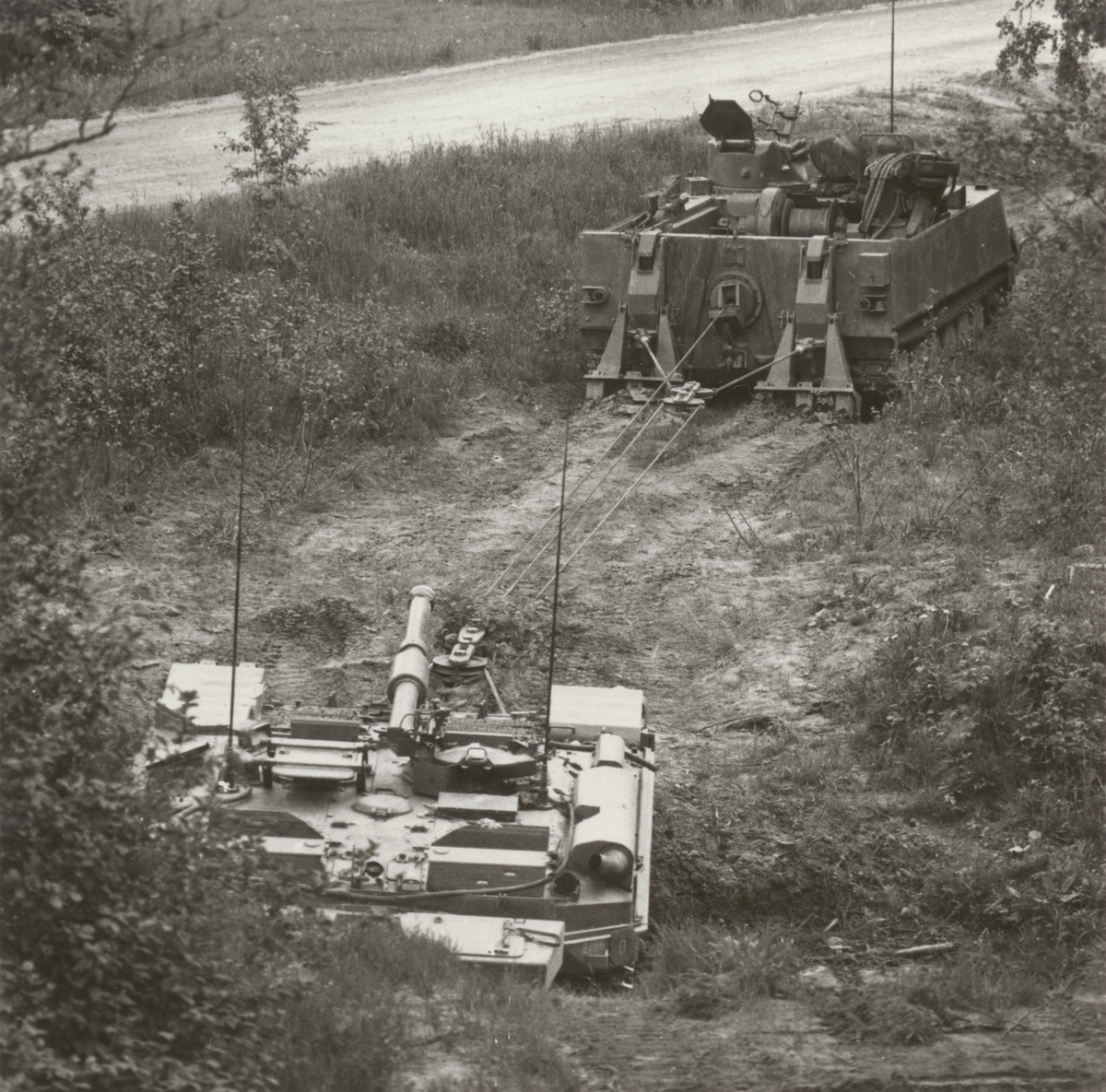 Titel: Pansarbandvagn ombyggd till bärgningsfordon 82 bogserar en stridsvagn 103 upp på landsväg.