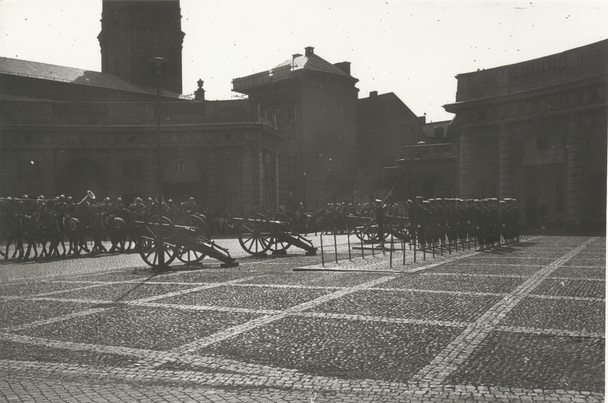 Beriden högvakt från K 1 tågar in på yttre borggården vid Stockholms slott.