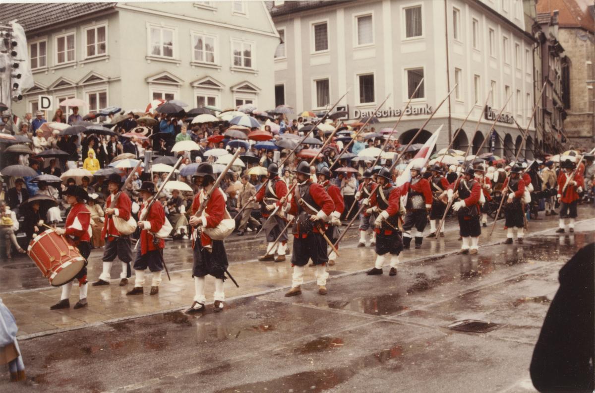 Kostymparad av Society of Cavaliers and Roundheads (från Cromwells tid) på ett torg i Memmingen, Bayern.