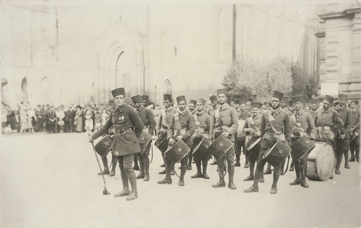 Titel: Franska ockupationen av Tyskland. Marockansk musikkår i Wiesbaden.
