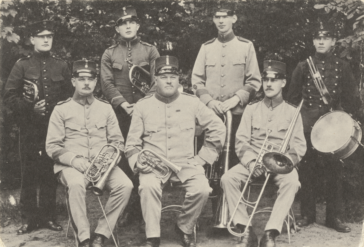 Skaraborgs flygflottilj F7, flygvapensymbolen med texten Första flygeskadern.Karlsborgs fästning. Artilleriets musikkår, sju män poserar i trädgården med sina instrument. Uniform m/1910.