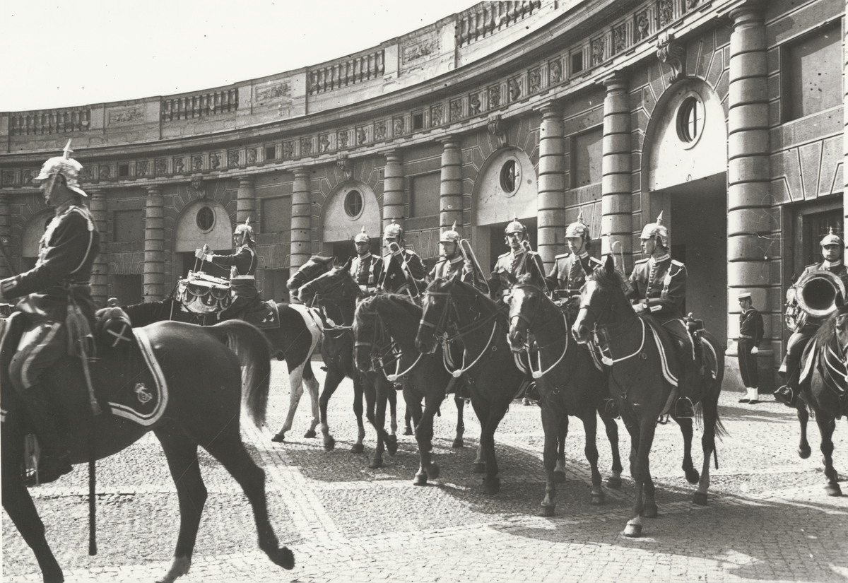 Närbild på beriden musikavdelning från K 1 på yttre borggården, Stockholms slott.