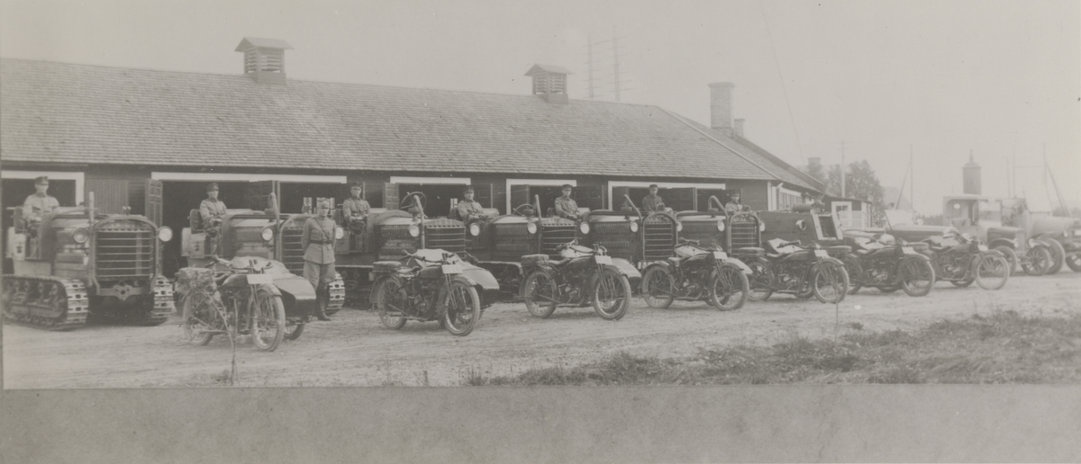Norrlands artilleriregemente A 4, garage med traktorer och motorcyklar med sidovagn uppradade.