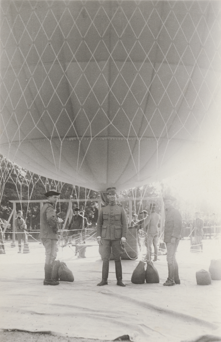 Kapten Yngve Stiernspetz står under en fylld ballong, nedtyngd av sandsäckar, på läroverkets gård i Jönköping.