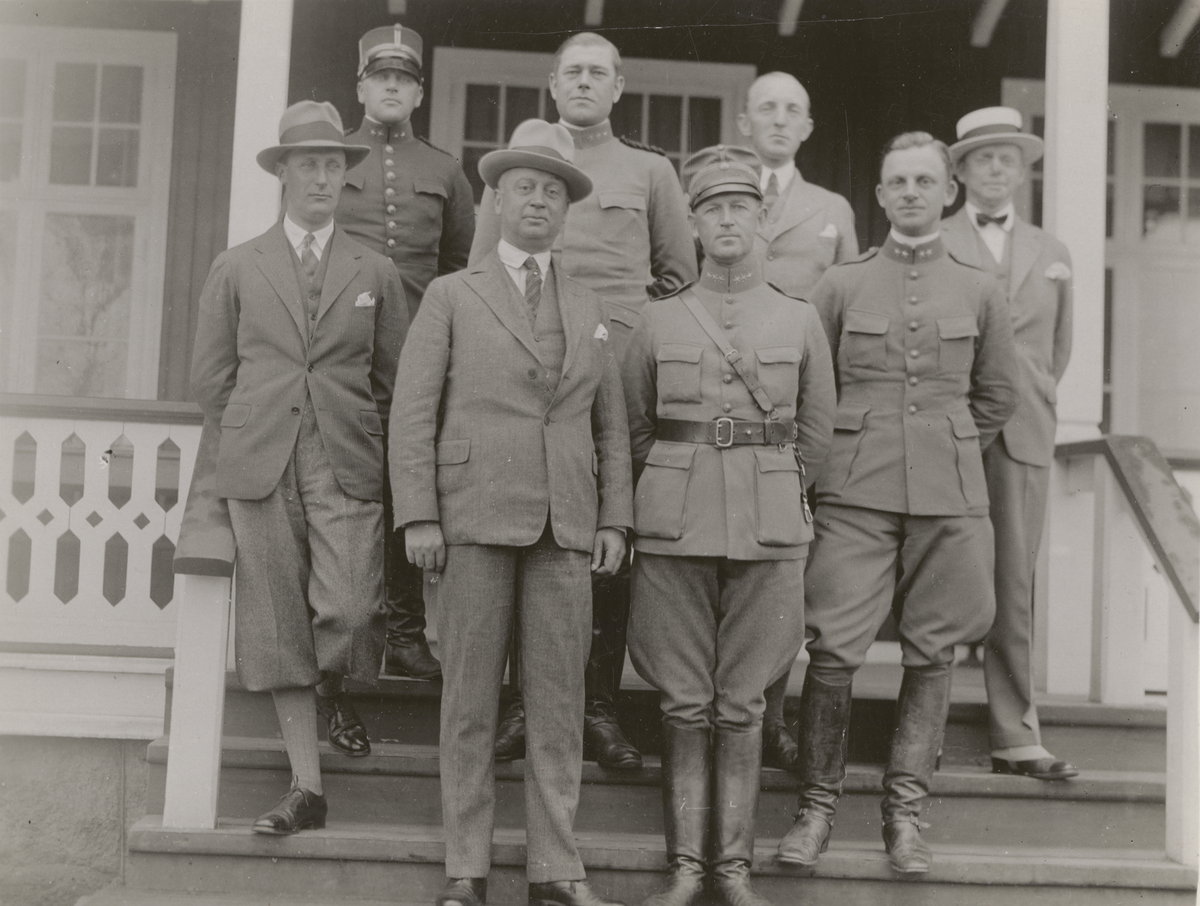 Åtta män på trappa till veranda, hälften i uniform. Löjtnant Allan Stuart och kapten Yngve Stiernspetz, A6 Skillingaryd.