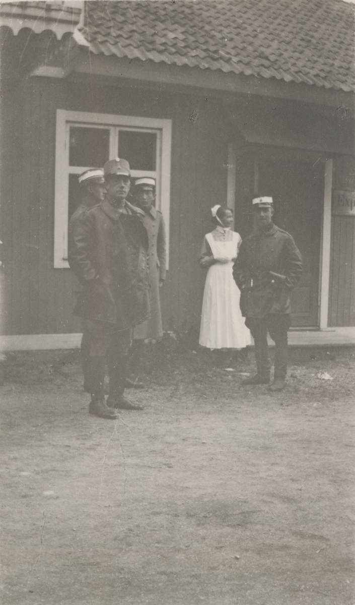 Sjuksköterska med fyra soldater utanför expedition i Salatrakten, uniform m/1939.