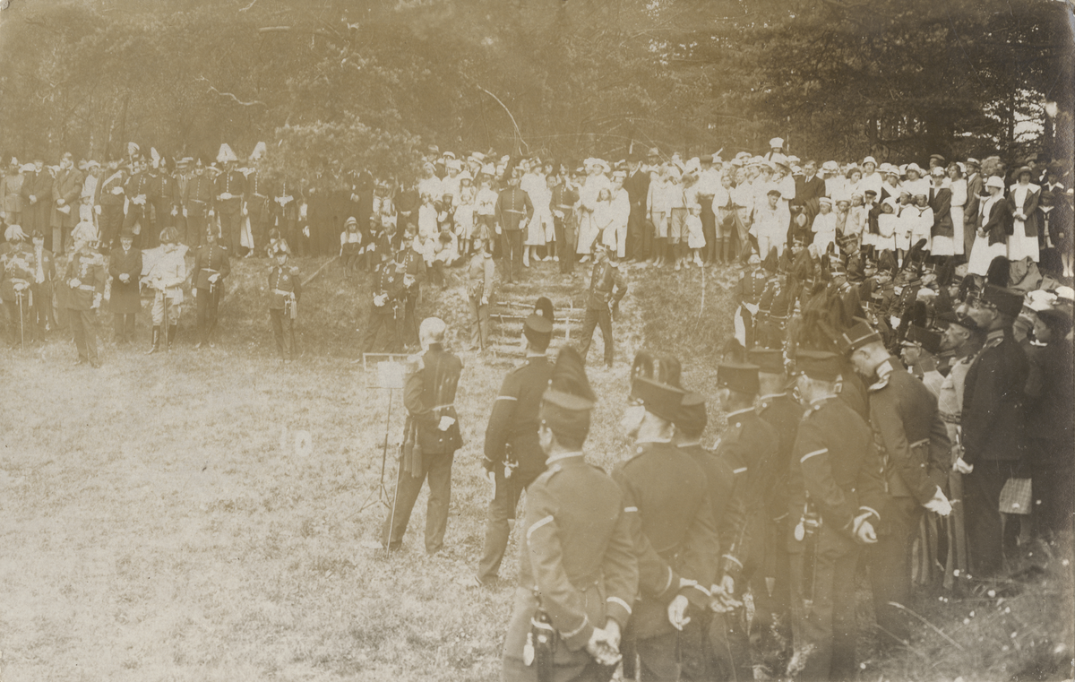 Titel: Folksamling och militär ceremoni i parkmiljö.