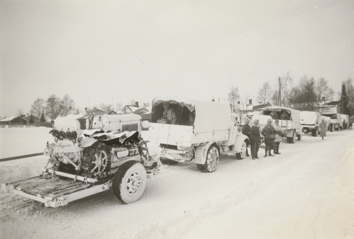 Titel: Fordonskolonn i vinterlandskap.