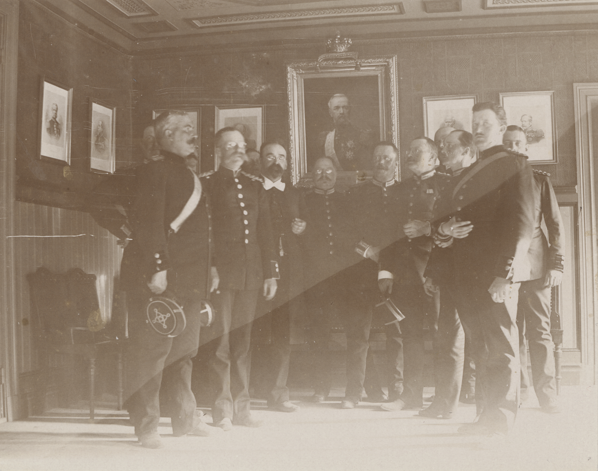 Titel: Hälsinge regemente I 14 Mohed. Grupp officerare uppställda inne i officersmässen.