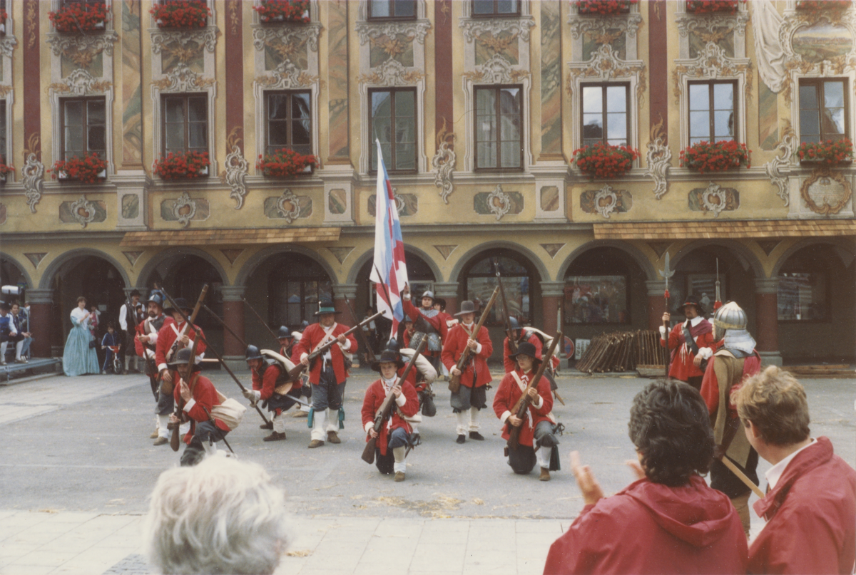 Kostymparad av Society of Cavaliers and Roundheads (från Cromwells tid) på ett torg i Memmingen, Bayern.