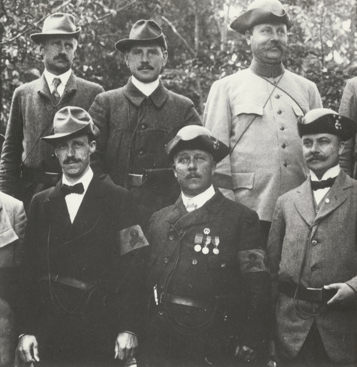 Titel: Landstormsmän uppställda i Österbybruk. I främsta ledet står brukets kamrer Carl Warfvinge.