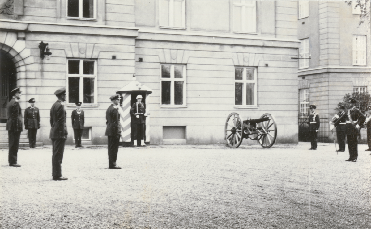 Titel: Livregementets grenadjärer I 3. Vaktpost med kulsprutepistol m/1945 vid kur utanför regementsbyggnad.