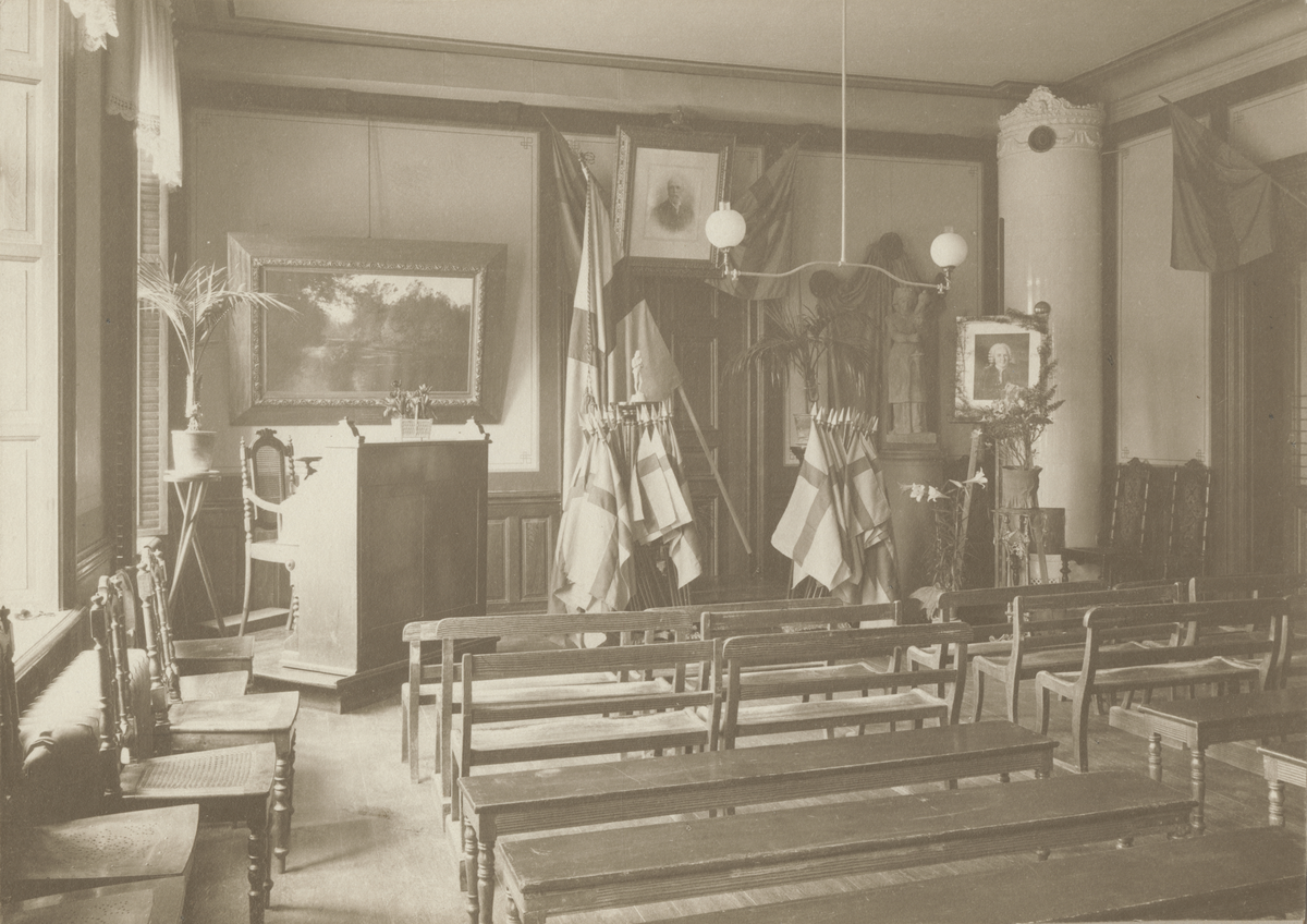 Arkitektur. Hälsinge regemente I 14, samlingssal med bänkar och pulpet.