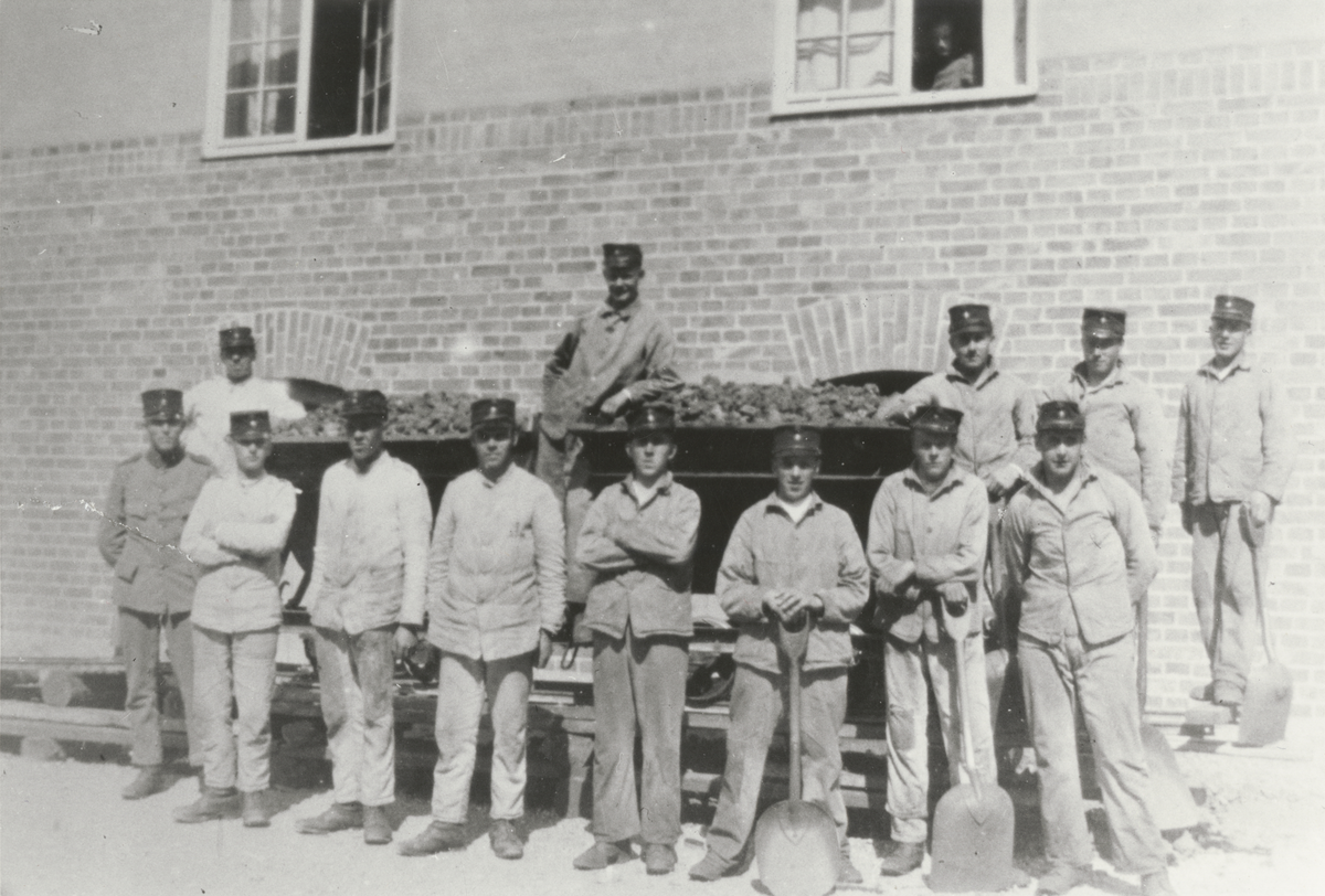 Titel: Arbetsklädda soldater med skovlar i händerna står omkring två stenkolslastade vagnar vid ett hus.
