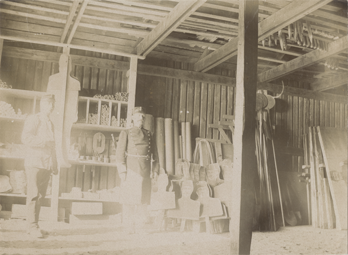 Titel: Hälsinge regemente I 14 Mohed. Insidan av ett förråd med bland annat måltavlor.