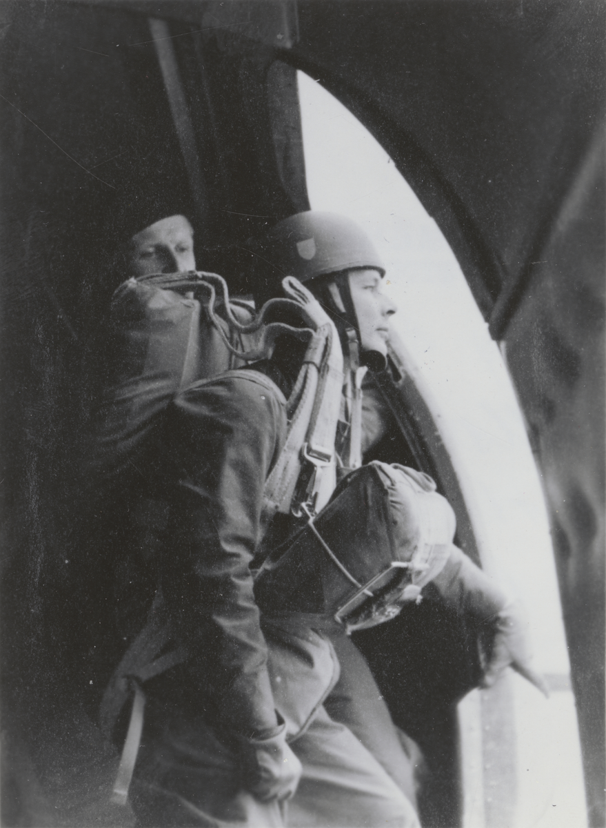 Fallskärmsjägare uppställd vid uthoppsdörren, beredd på hopp från en DC-3 (C-47). Fallskärmsjägarskolan, Karlsborg, 1951.