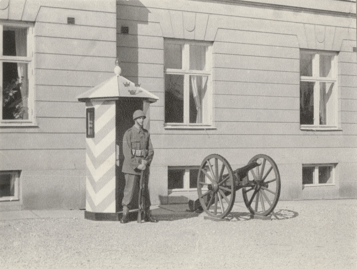 Livregementets grenadjärer I 3. Vaktpost med gevär m/1896 vid kur utanför regementsbyggnad. Uniform m/1939.
