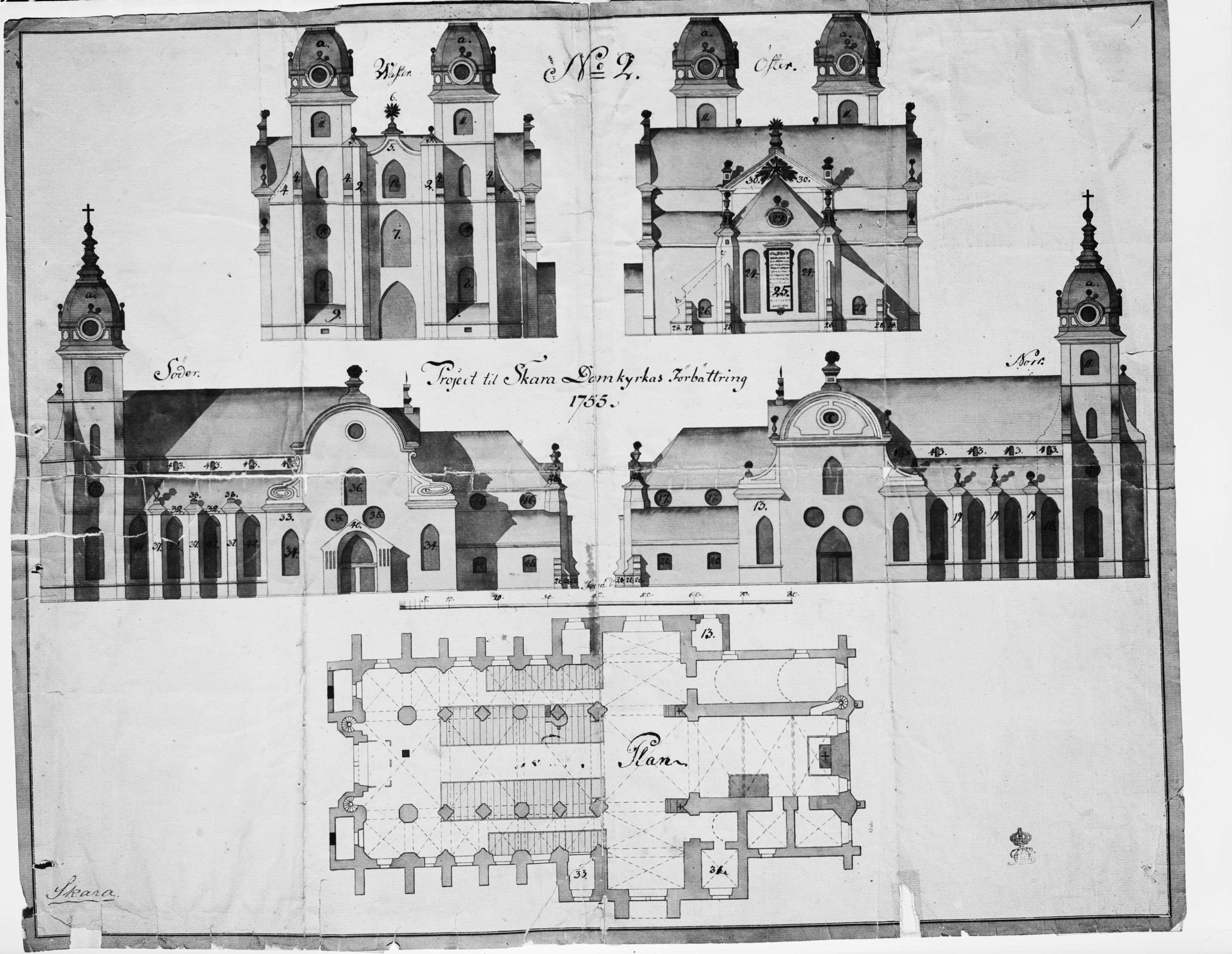 Ritning över samtliga fasader, samt planritning. Foto efter ritning.