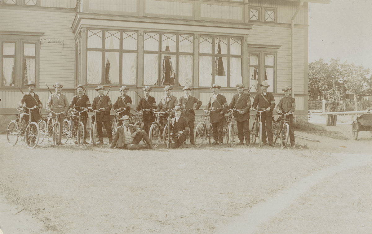 Hälsinge regemente I 14 Mohed. Velocipedordonnanser utanför ett hus, klädda som landstormsmän.