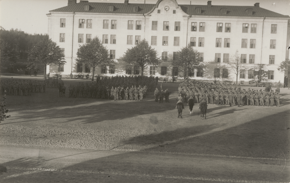 Titel: Hallands regemente I 16 uppställt framför regementsbyggnaden.