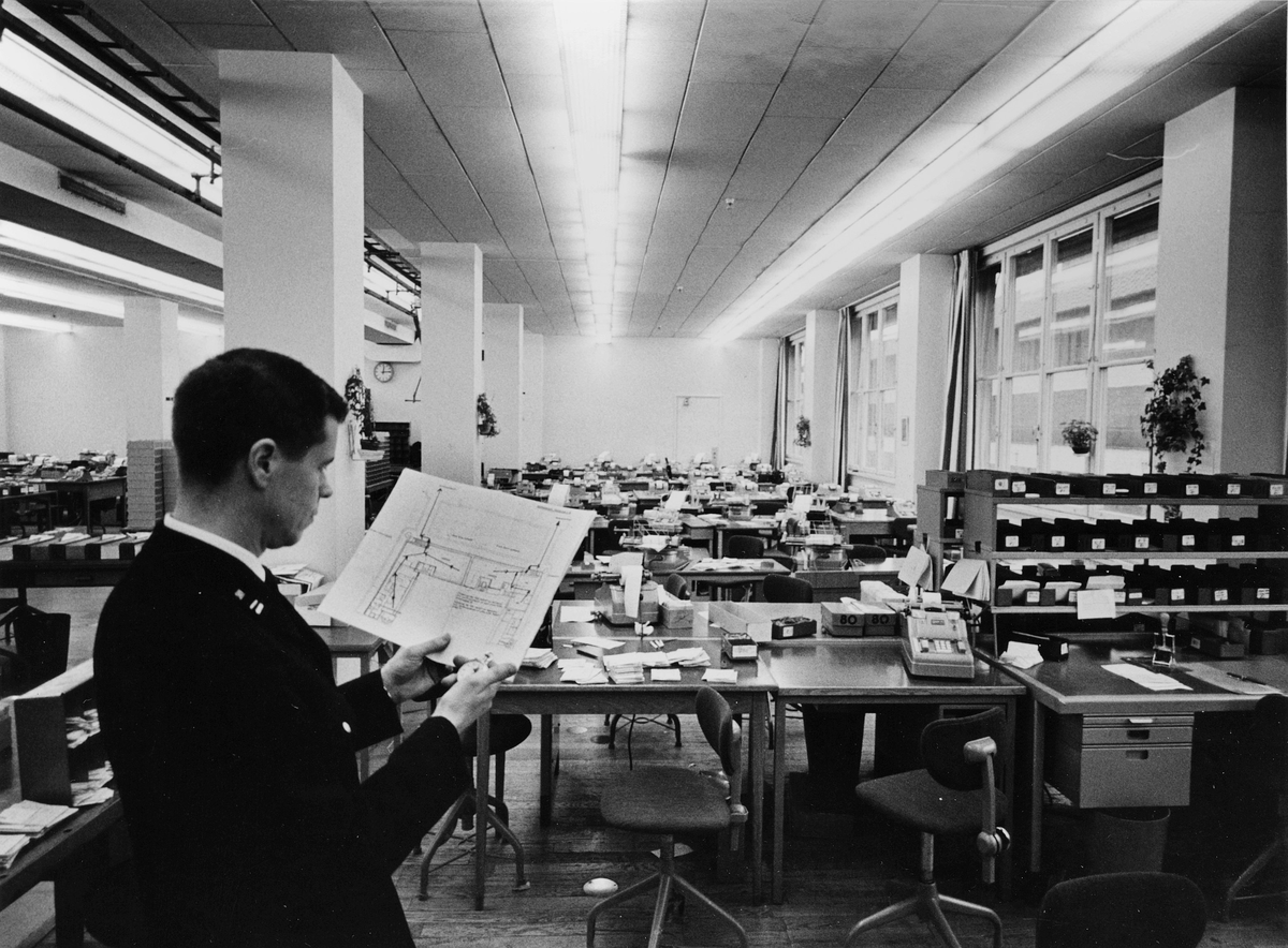 En representant för vaktbolaget studerar utrymningsplanen medan den