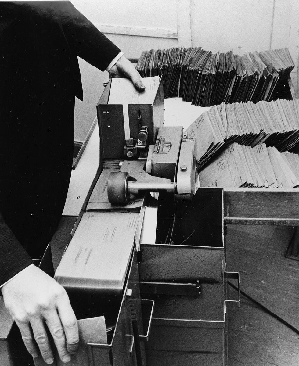 Ankommande post i "ljusgården". De bruna kuverten öppnas i
