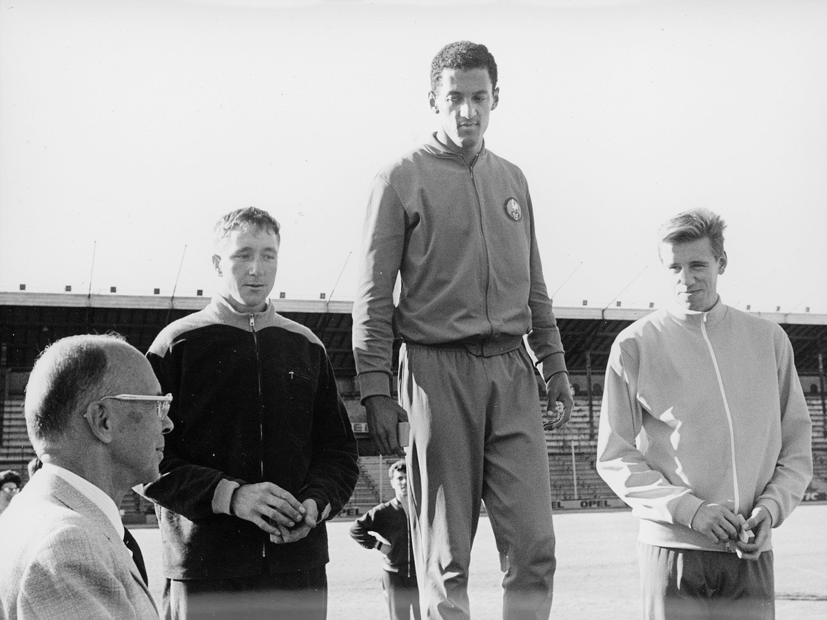 Prisutdelning i höjdhoppstävlingen. Segraren Robert Sainte-Rose,