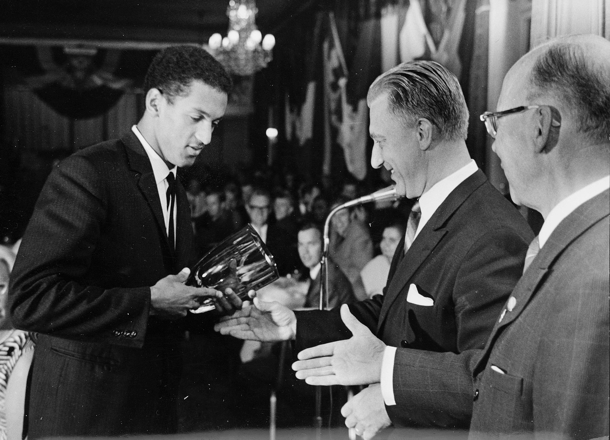 Generaldirektör Nils Hörjel överlämnar priset för segern i höjdhopp