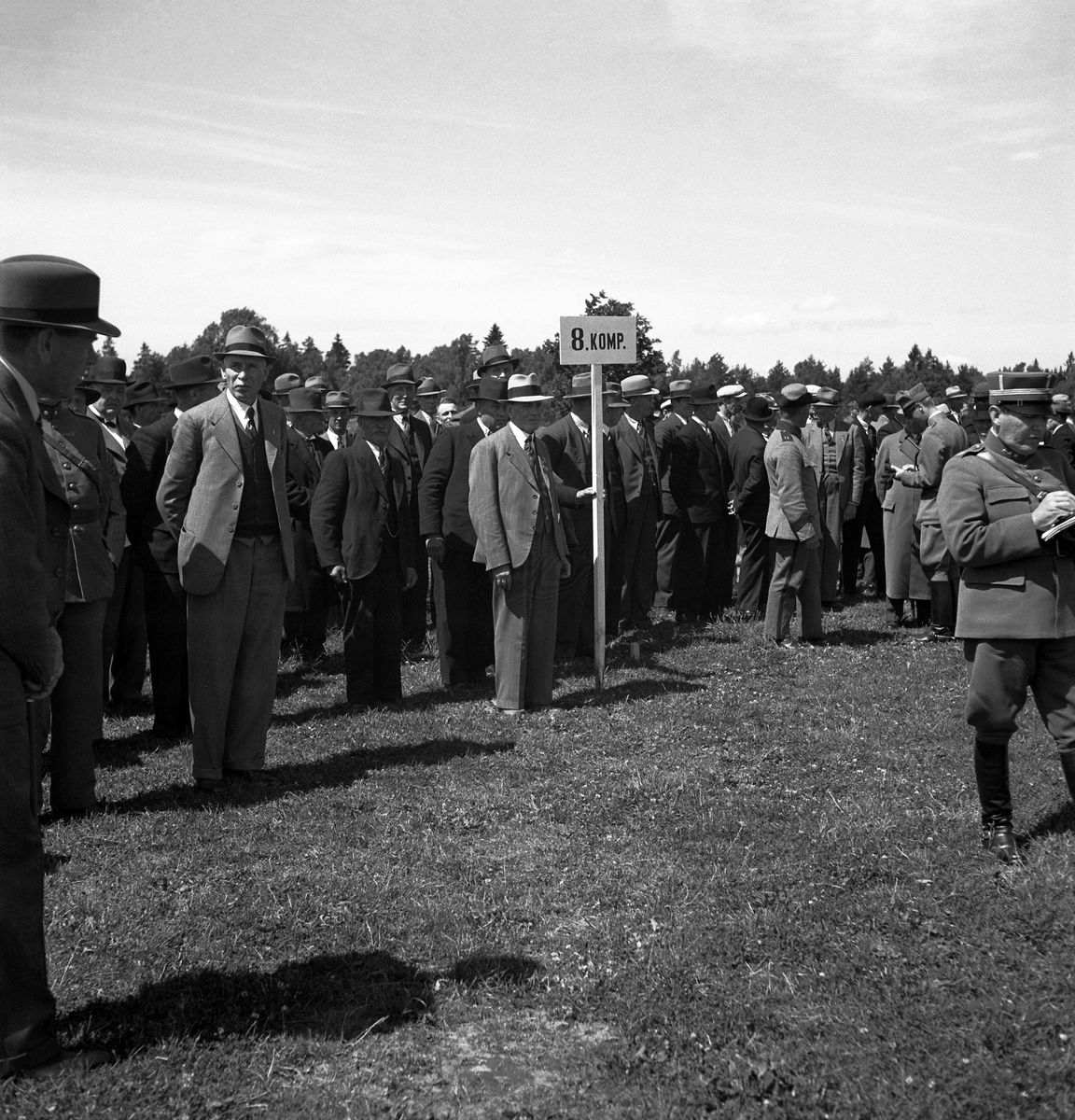 Kamratmötet, I 11. Samling på övningsfältet. Ett antal äldre herrar i kostym och hatt m.m., har ställt upp sig med kompaniskyltar m.m. Man ser också en del herrar i uniform, m/10 och m/23.