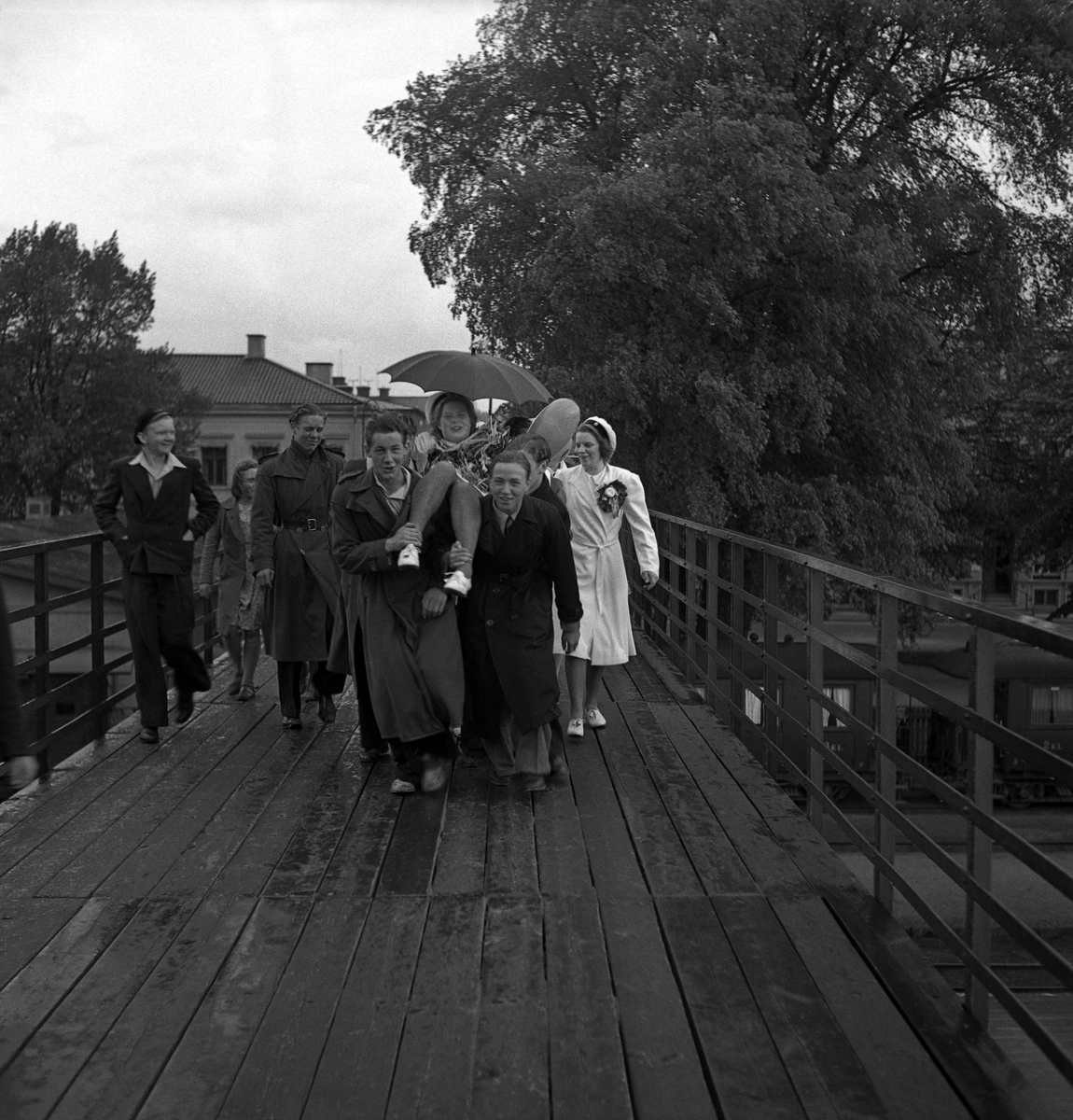 Studenterna 1940. 31/5 - 1/6. En kvinnlig student bärs längs med gångbron över järnvägen, från Norra Järnvägsgatan.