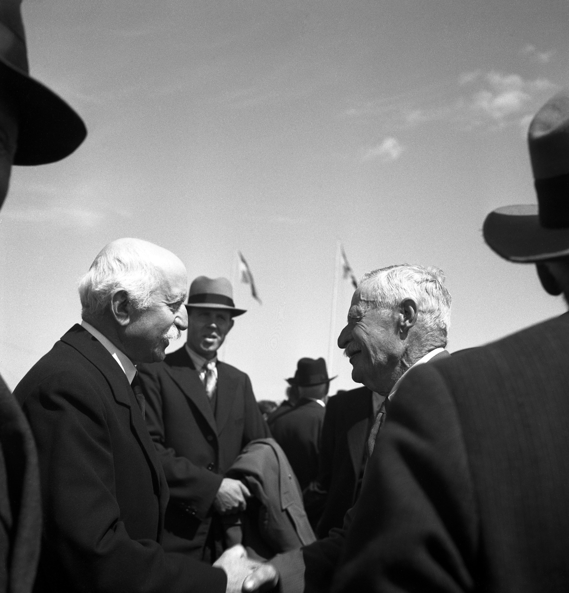 Kamratmötet, I 11. Samling på övningsfältet. Några äldre herrar i kostym m.m. hälsar glatt på varandra.