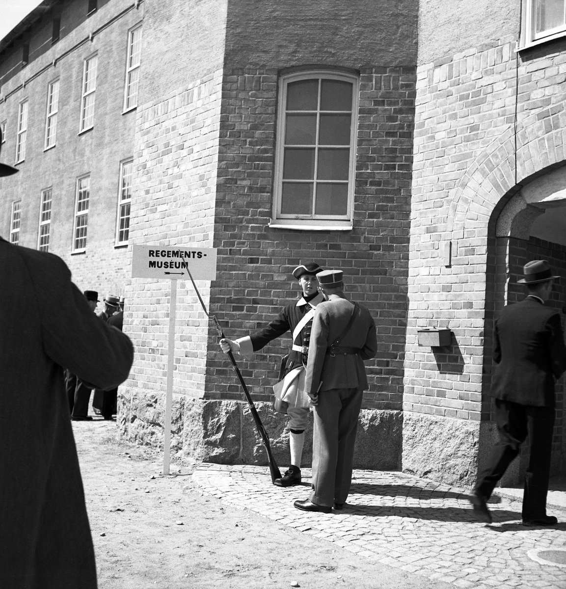Kamratmötet, I 11. Ingången till regementsmuseet, med en man klädd i karolineruniform. Han blir tillfrågad något av en man klädd i uniform m/23.