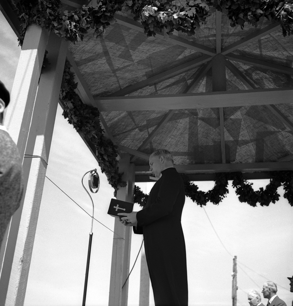 Kamratmötet, I 11. Samling på övningsfältet. En präst håller andakt från den girlandprydda tribunen.