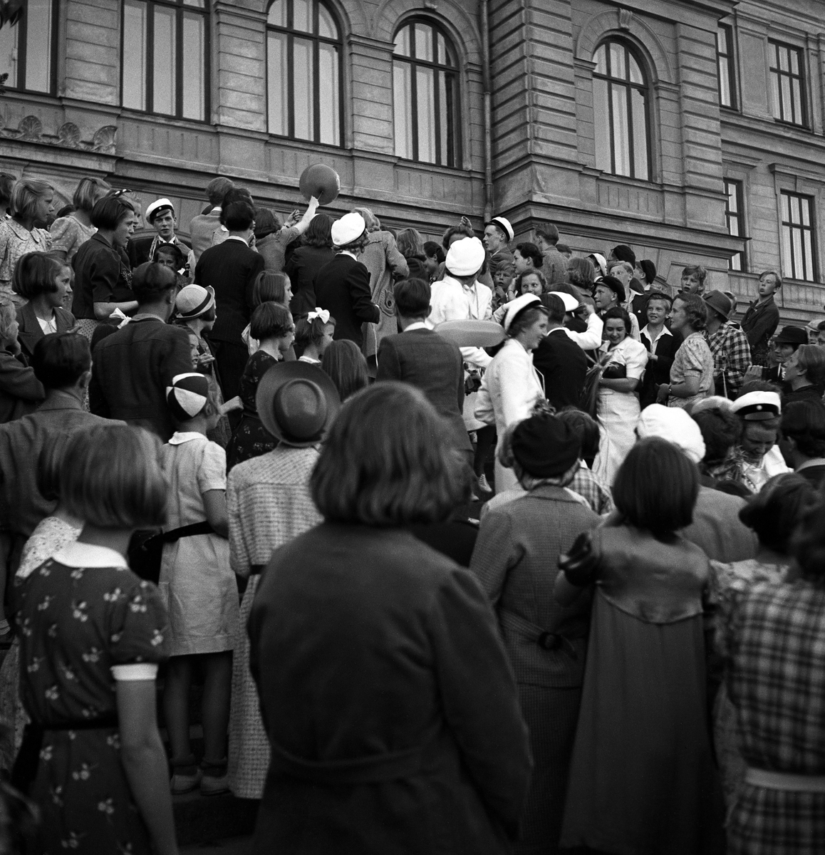Studenterna, 1939. Studenter och anhöriga på trappan till Växjö Högre Allmänna Läroverk.