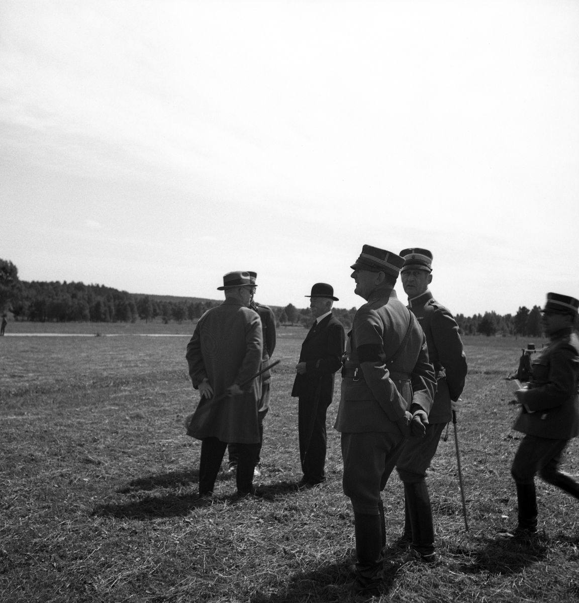 Kamratmötet, I 11. Ett antal herrar i uniform och några civila, står och pratar på övningsfältet.