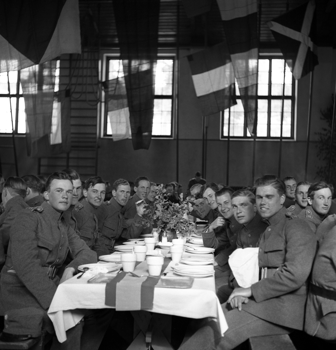 Kamratmötet, I 11. Middag på regementet. En del av mannarna, iklädda uniform m/10 (?). I taket hänger ett antal signalflaggor.